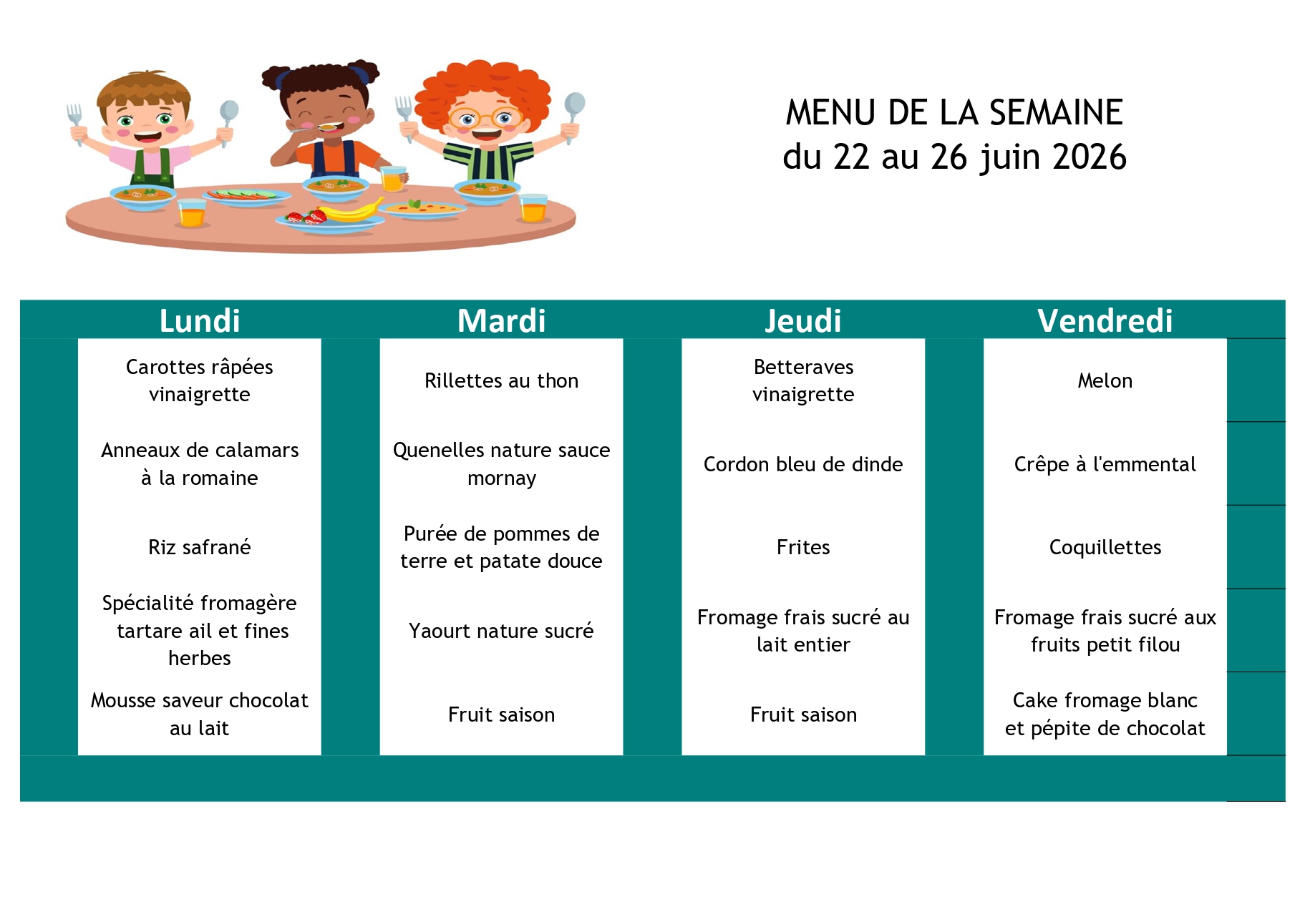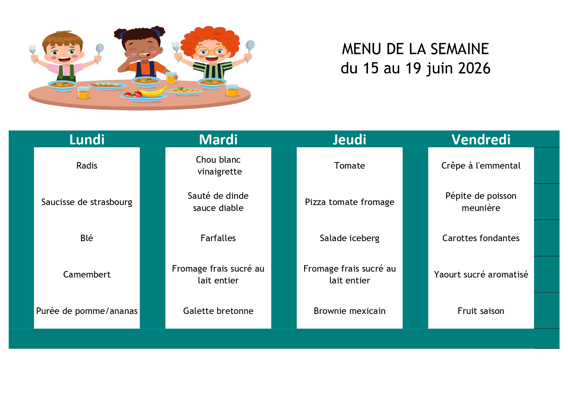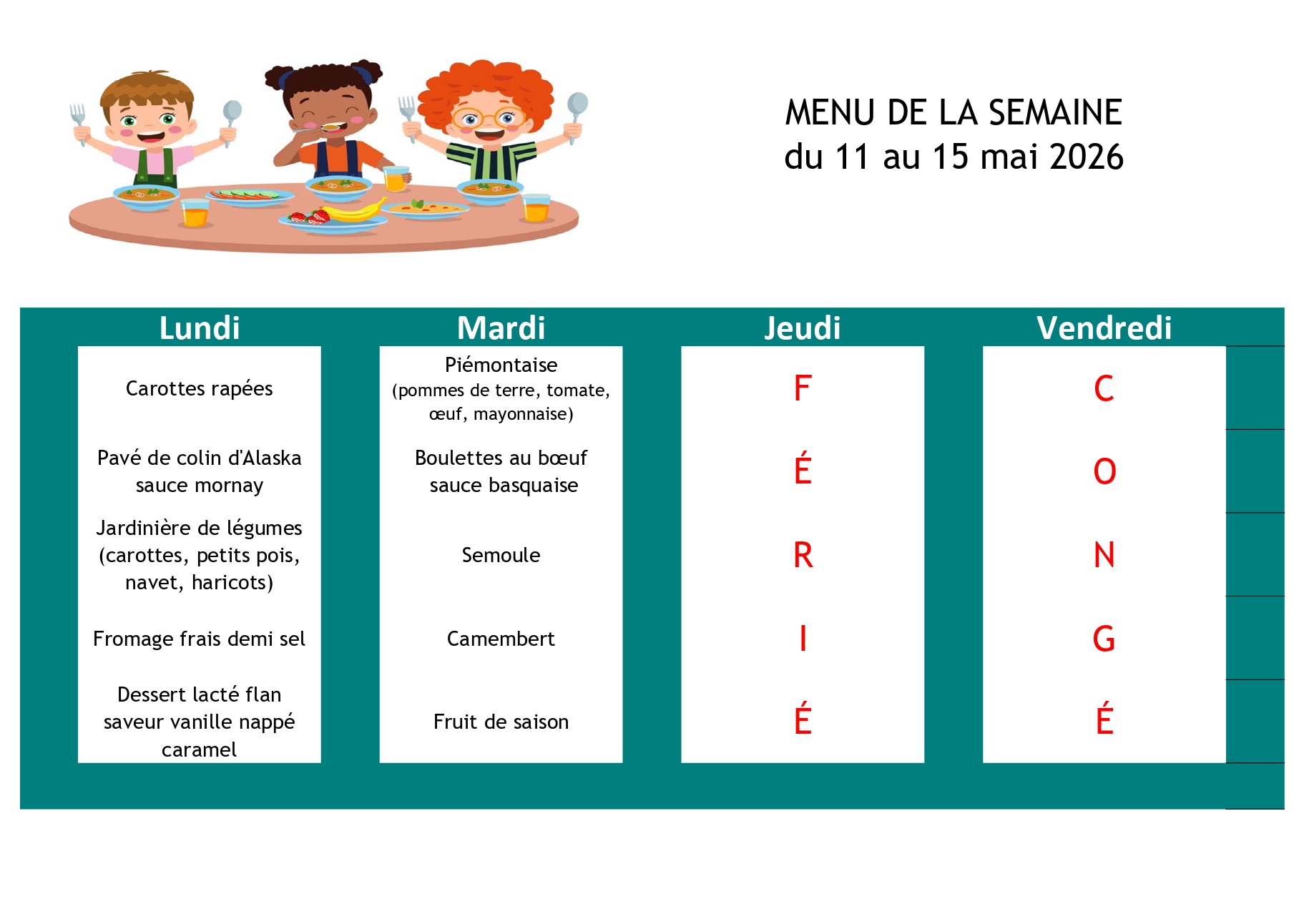 Ci-après les menus de la cantine scolaire. Depuis la rentrée 2024, les repas sont assurés par la société " La Normande", les menus sont choisis par un membre du service cantine scolaire, du Maire, de l’adjointe au Maire chargée aux affaires scolaires ainsi que des parents d’élèves.