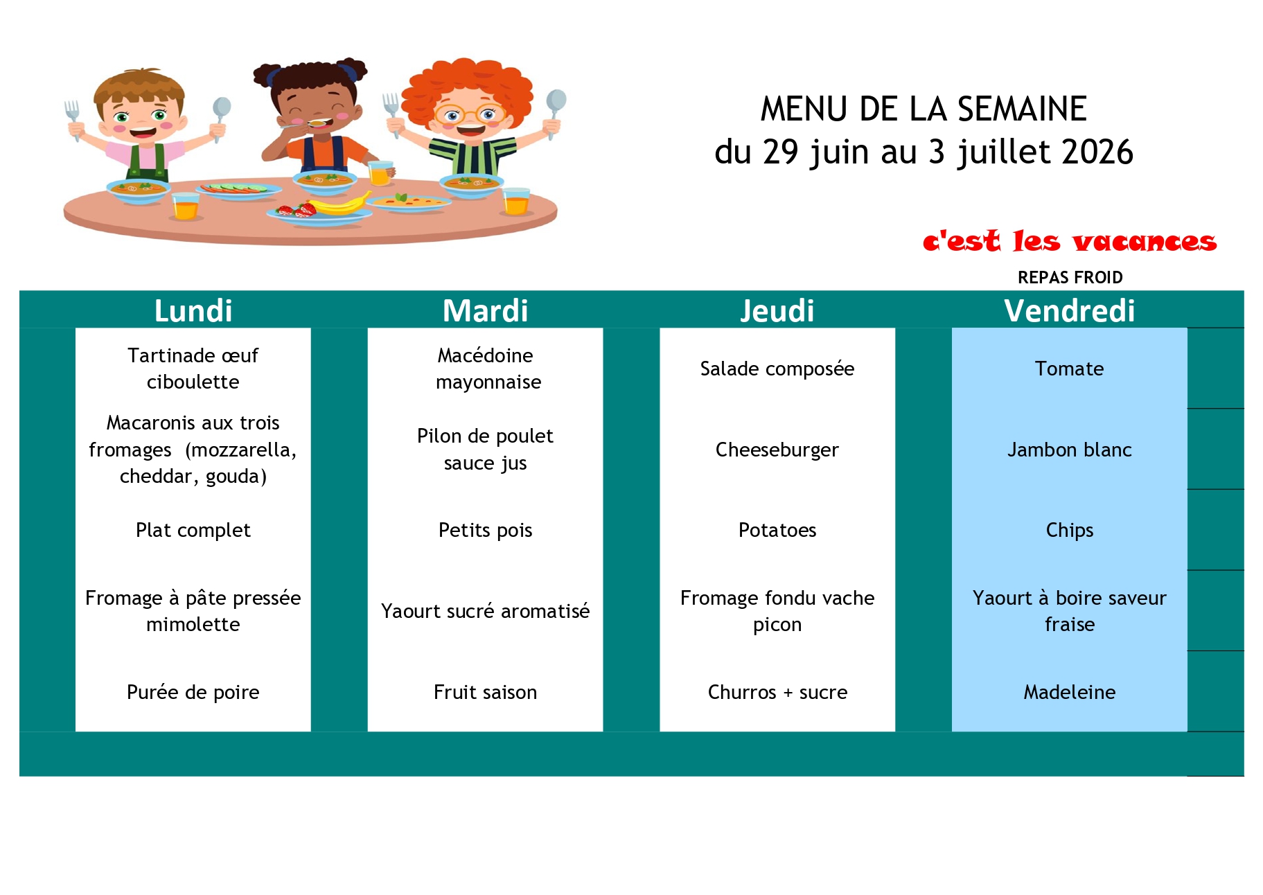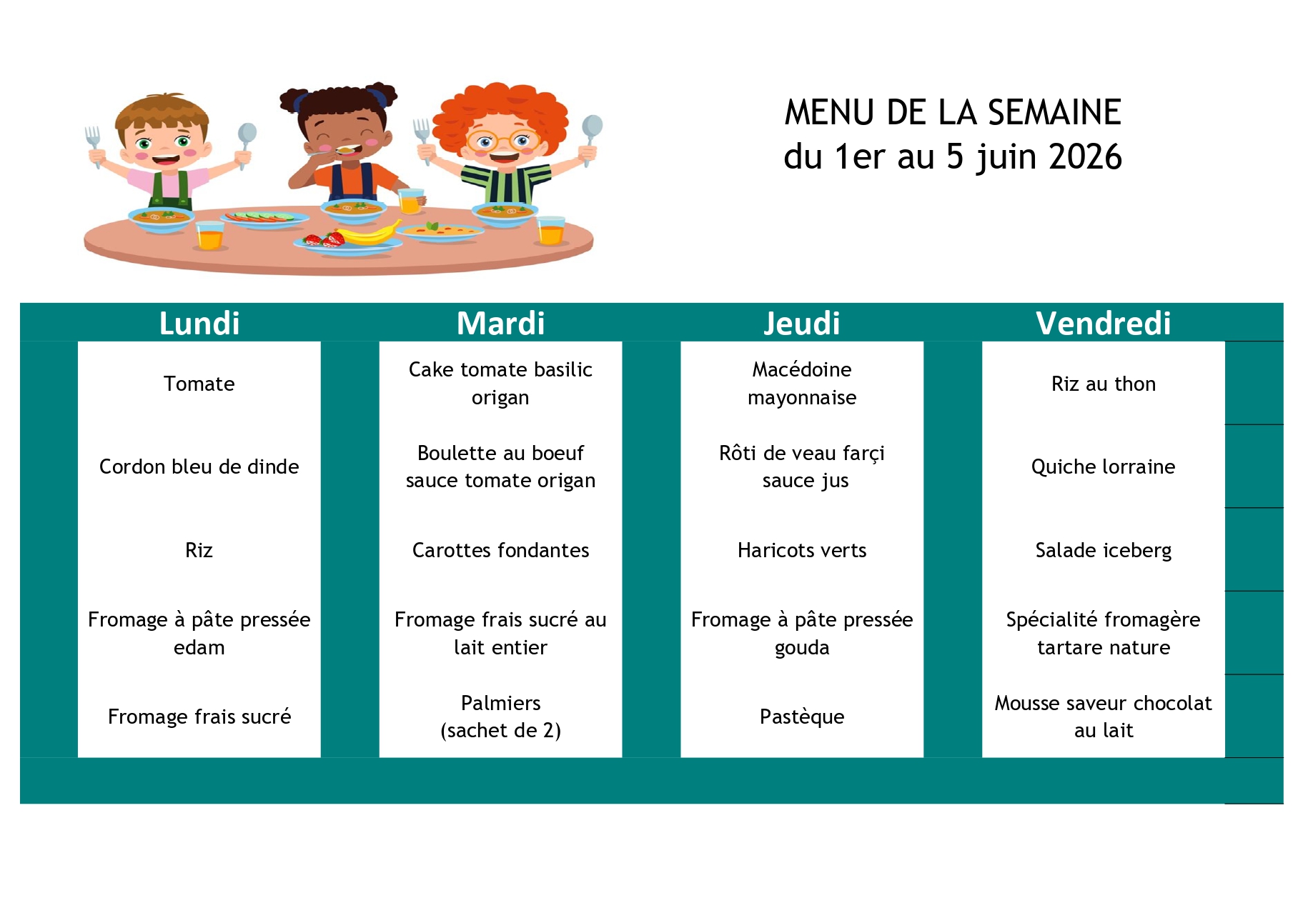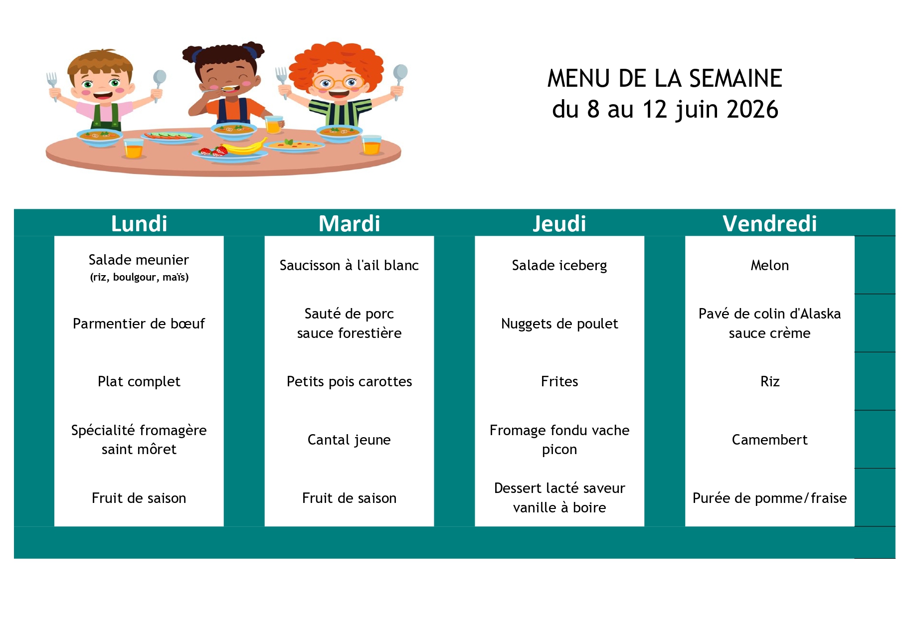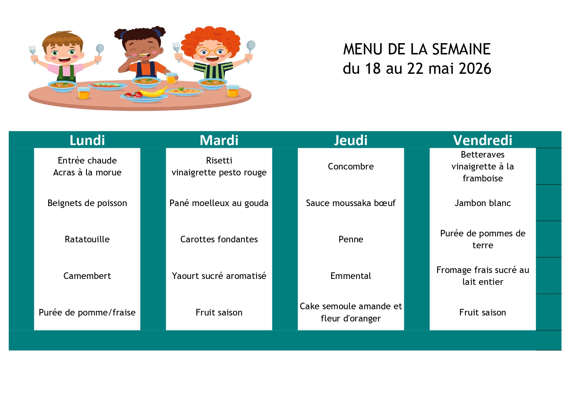 Ci-après les menus de la cantine scolaire. Depuis la rentrée 2024, les repas sont assurés par la société " La Normande", les menus sont choisis par un membre du service cantine scolaire, du Maire, de l’adjointe au Maire chargée aux affaires scolaires ainsi que des parents d’élèves.