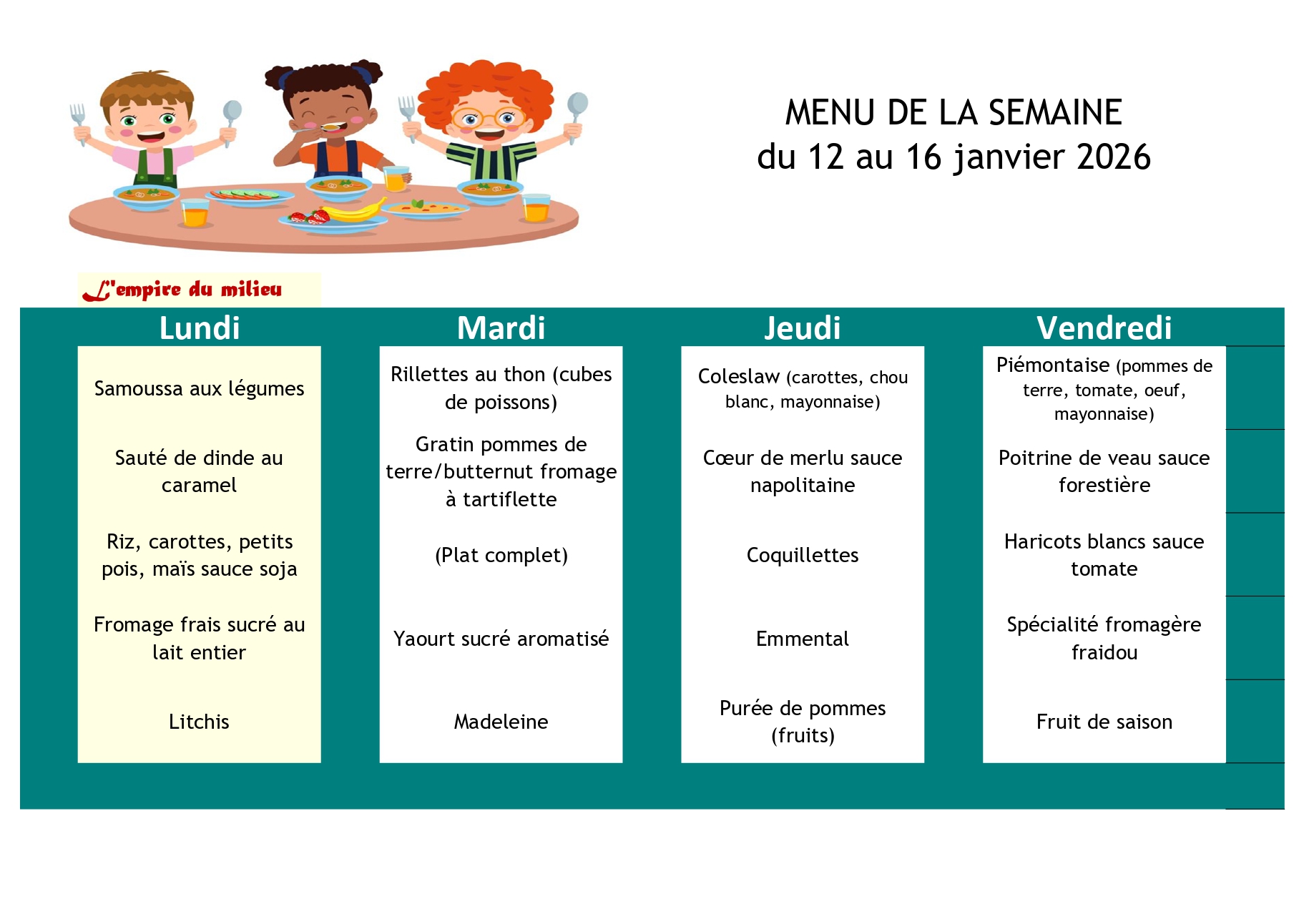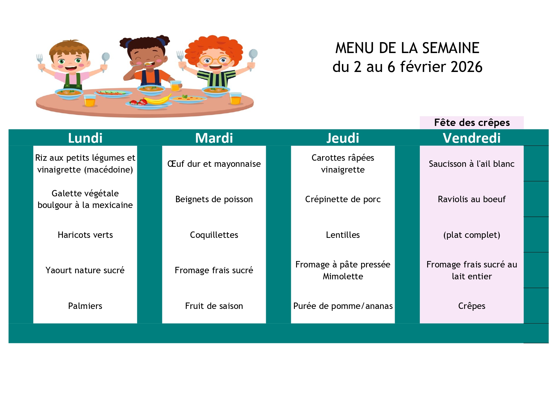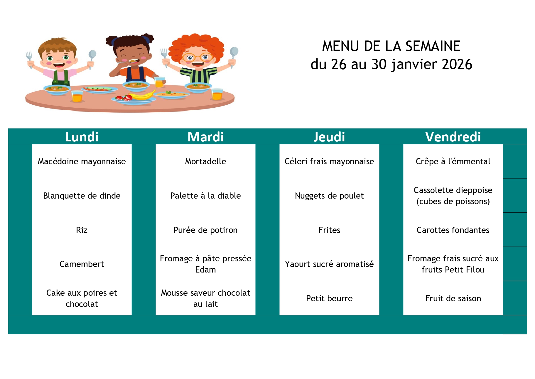 Ci-après les menus de la cantine scolaire pour la rentrée du 01/09/2025. Depuis la rentrée 2024, les repas sont assurés par la société " La Normande", les menus sont choisis par un membre du service cantine scolaire, du Maire, de l’adjointe au Maire chargée aux affaires scolaires ainsi que des parents d’élèves.